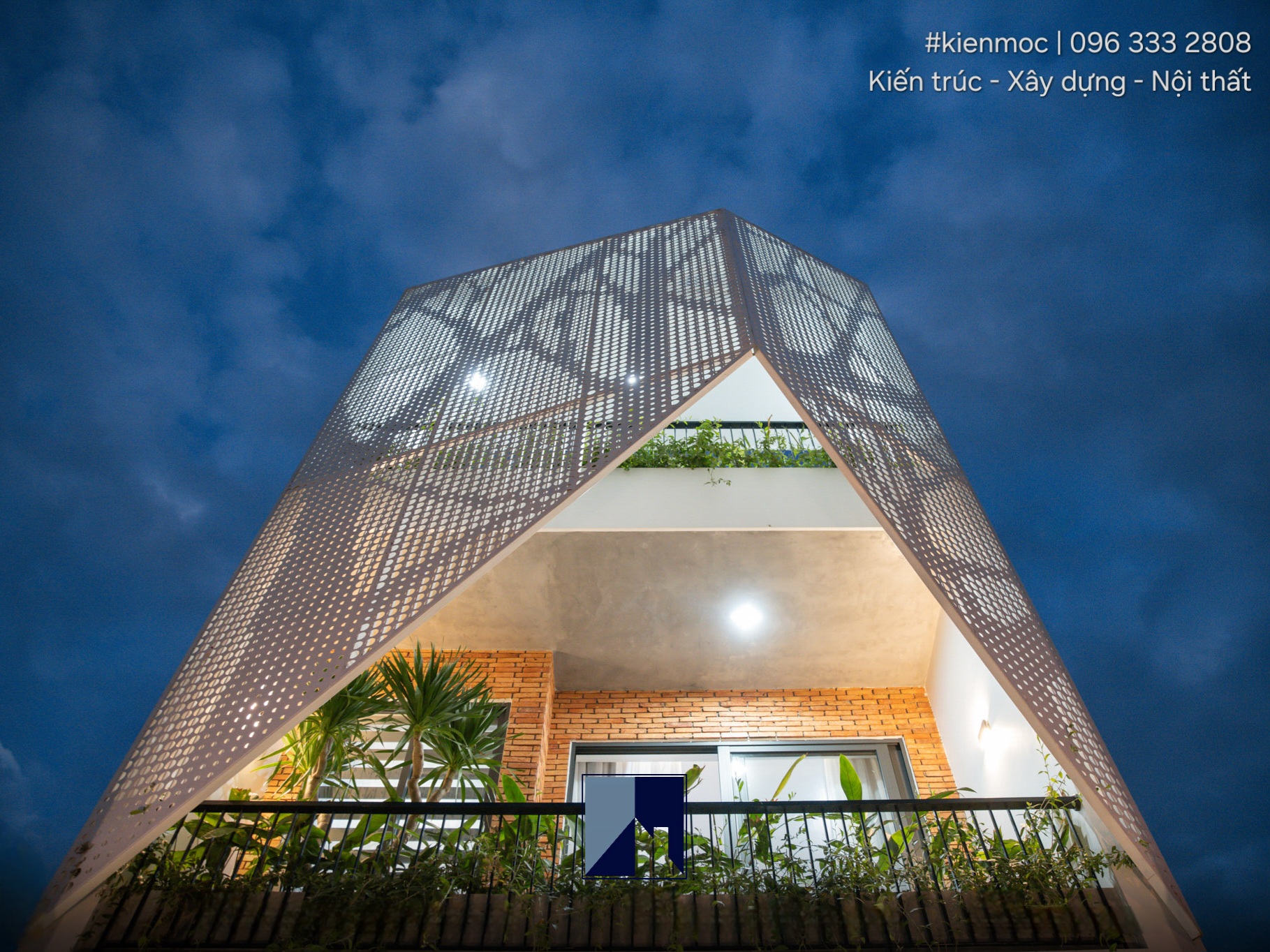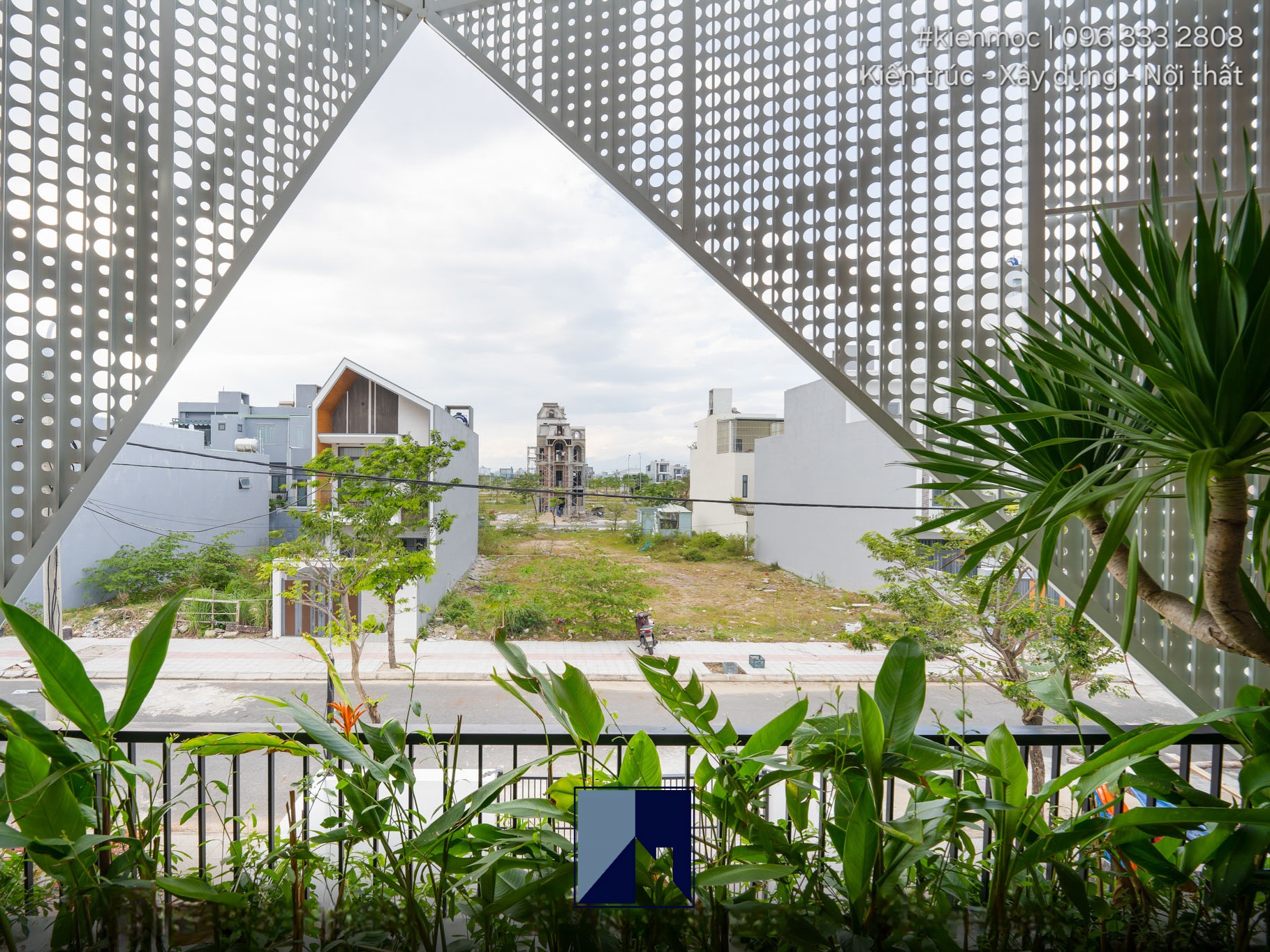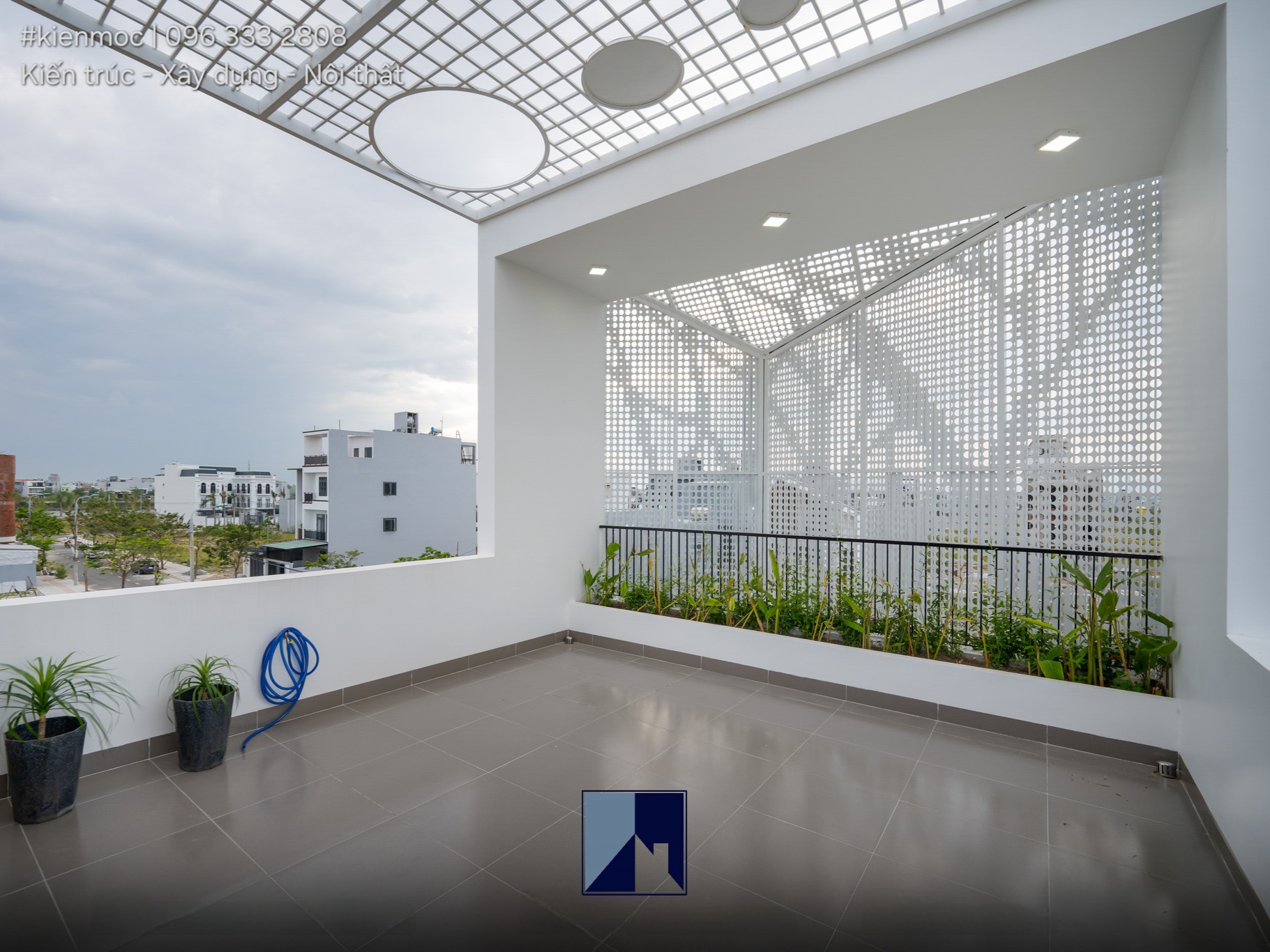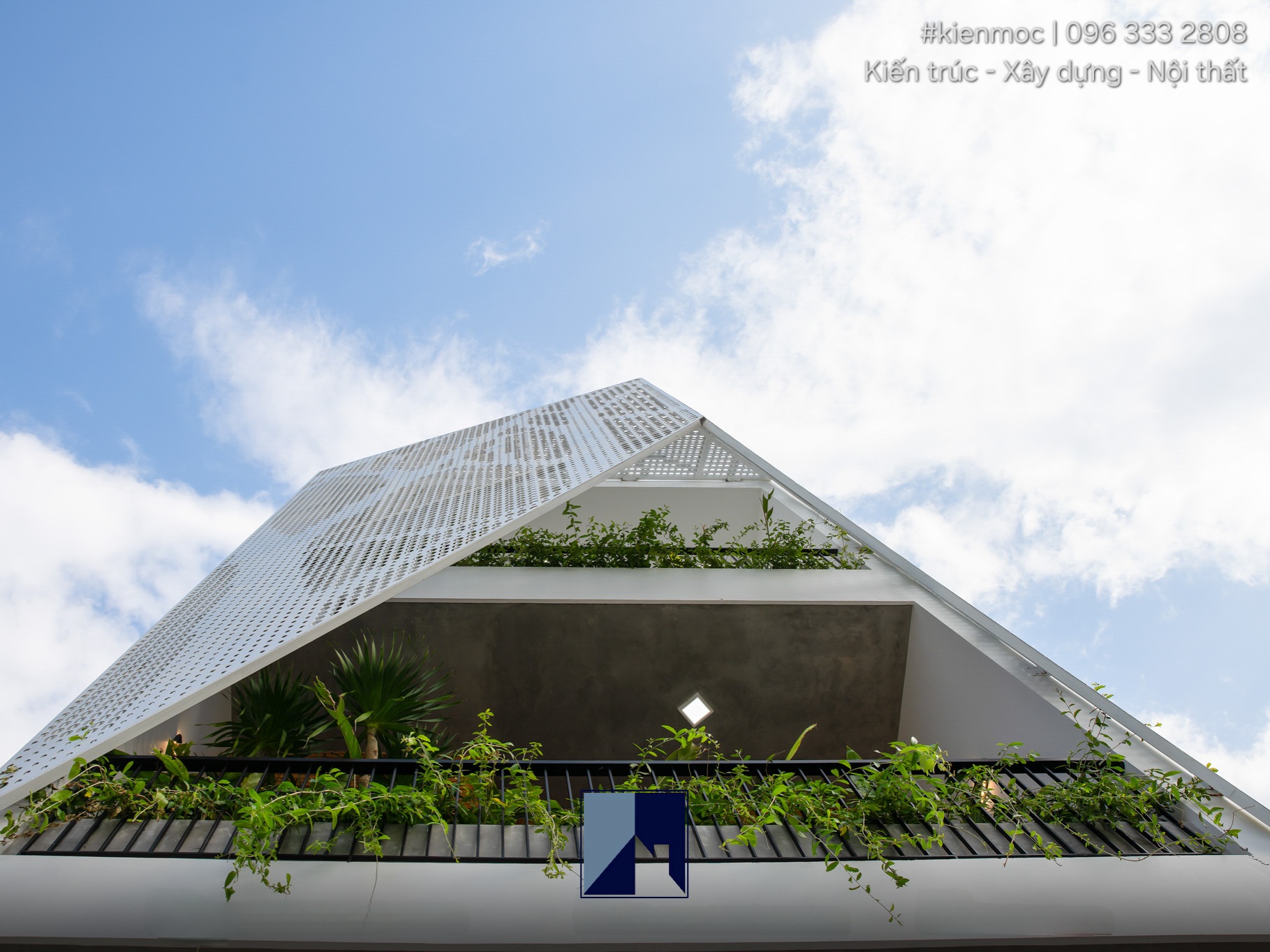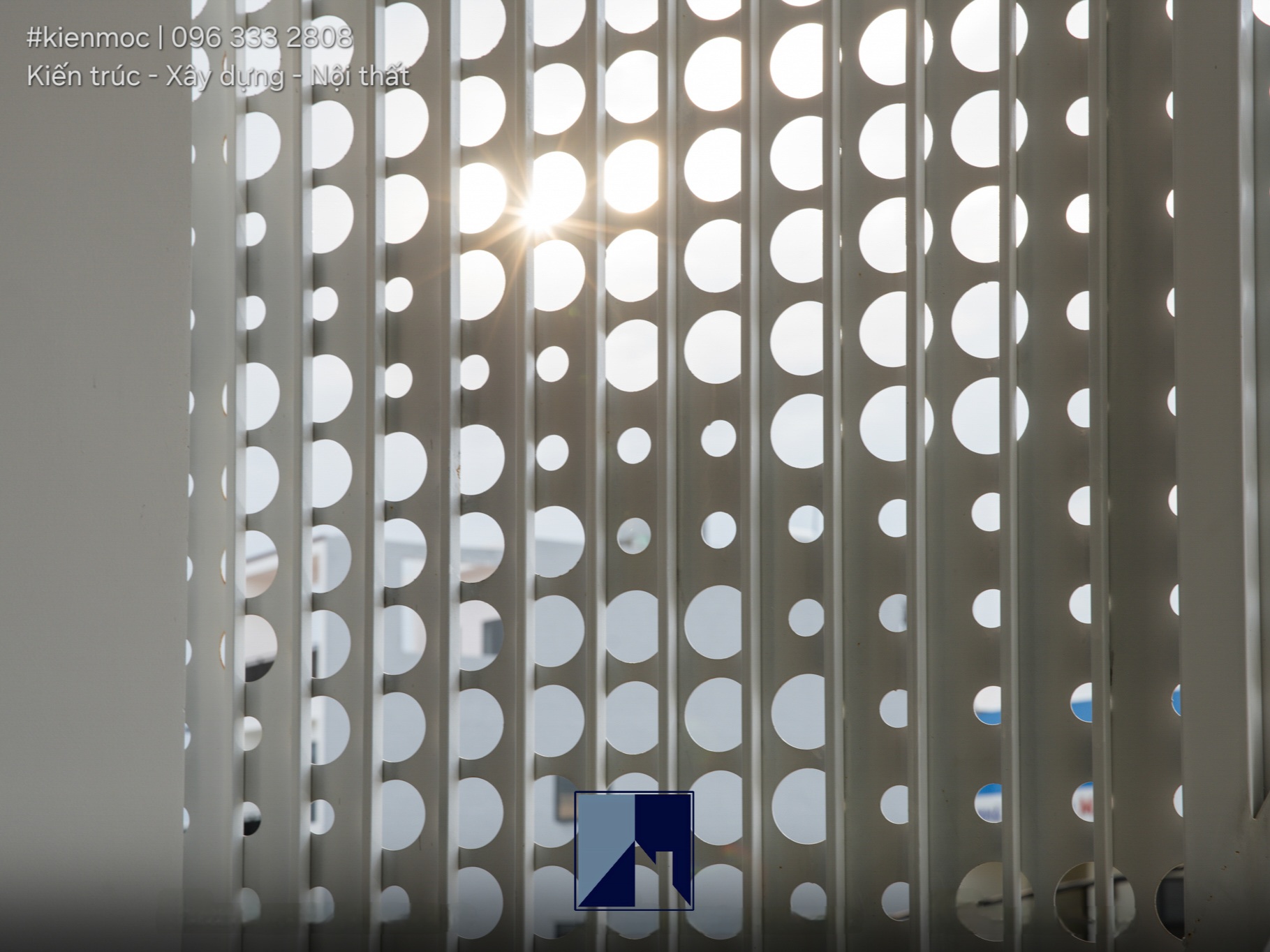 Thay vì sử dụng kiểu giàn che phổ biến như những mẫu nhà phố khác, KMid’s House được thiết kế một hệ mái thép sơn tĩnh điện cho tầng 2 và tầng 3, có hình dáng và chi tiết lạ. Không còn là những đường nét thẳng và vuông vức, mẫu lam tránh nắng này có các chi tiết lỗ tròn với nhiều kích cỡ khác nhau, liên kết trên một bề mặt vào tạo ra họa tiết riêng biệt. Cấu trúc nhô ra ở trước mặt tiền nhằm cản nắng từ 2 phía, đồng thời cũng tăng thêm giá trị thẩm mỹ và tính mới lạ trong kiến trúc nhà lô ống.